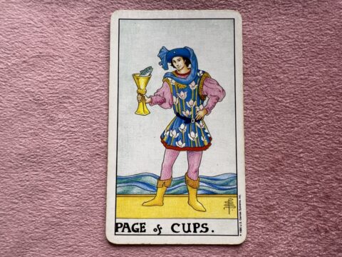 カップのページのタロットカード。素直な優しさを意味します。感情を言葉にして伝えることで、思いがけない嬉しい展開が訪れそうです。くだらない話が鍵。