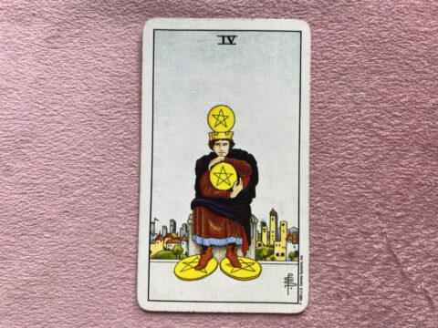金貨の4のタロットカード。守りと安定を意味します。慌ただしい流れにあなたの心まで持っていかれないようにしましょう。あなたのスタンスはそのままでいてください。