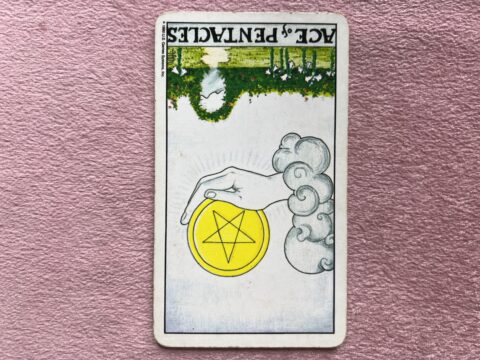 金貨のエースの逆位置のタロットカード。焦って成果を出そうとすると、せっかくのチャンスを逃す暗示。今は温める時期です。次に訪れるチャンスを見極めましょう。