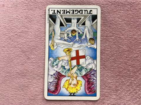 審判の逆位置のタロットカード。過去を手放すことを意味します。すぐに答えを出そうとせず、一度見直してくださいね。リセットした後には、より良い再出発が待っています。