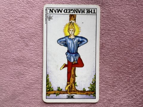 吊るされた男の逆位置のタロットカード。身を粉にすることを意味します。今のあなたはズタボロで、満身創痍です。ここまでよくやり切ったと自分自身を褒めましょう。