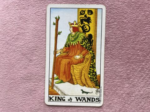 ワンドのキングのタロットカード。俯瞰して物事を見ることを意味します。今のあなたならどんな状況も思い通りに動かせるはず。自分を信じて堂々と行動して◎。