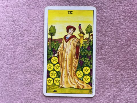 金貨の9のタロットカード。自立を意味します。あなたがこれまで築き上げてきた成果はもちろん素晴らしいことですが、新しい世界を取り入れる柔軟さを持ちましょう。