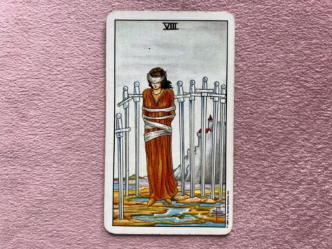ソードの8のタロットカード。雑念が入りやすいことを意味します。周囲の評価や期待にとらわれすぎず、今できることに集中してみましょう。不安が自信に変わっているはず。
