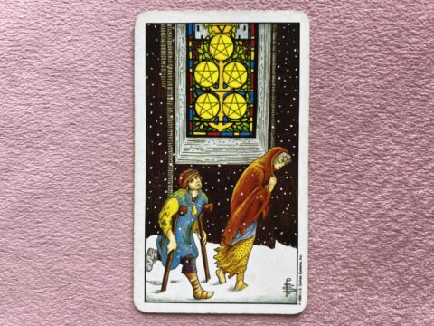 金貨の5のタロットカード。寂しい気持ちを意味します。でも今は遊んでいられません。過去の反省を活かし、今できることを一つずつ行動に移しましょう。