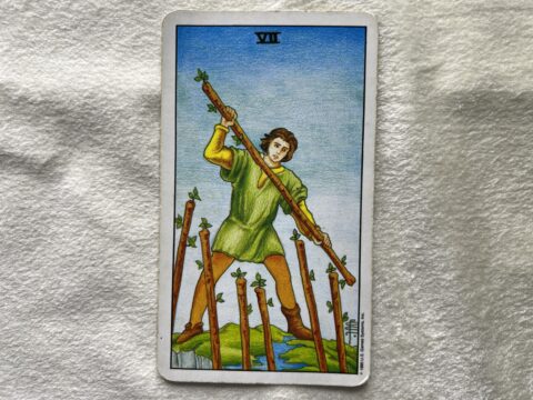 ワンドの7のタロットカード。自分の立ち位置をしっかり守りながら前に進む強さを意味します。周りに流されず、「私はこれでいい」と思える選択をすることで運気が整います。