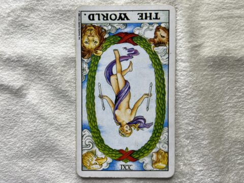 世界の逆位置のタロットカード。もう少し丁寧に見直すことで大成功に近づくことを意味します。今のあなたに足りない部分を整える意識を持つと良い結果に導かれます。