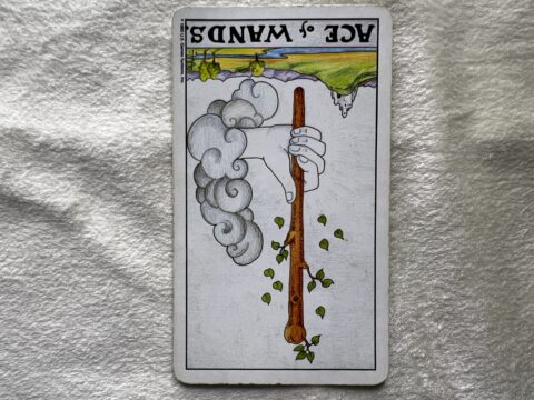 ワンドのエース逆位置のタロットカード。勢い任せではなく、タイミングを見極めて動くことの大切さを意味します。準備を整えてから一歩踏み出すことで、良い流れをつかめるはずです。