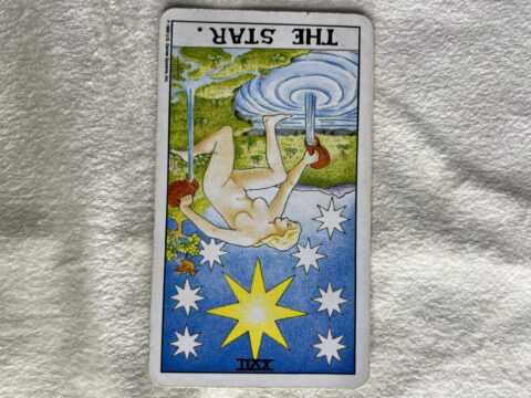 星の逆位置のタロットカード。いま目の前にあるものを大切にする意味です。理想を追いすぎないことで、現実の中にちゃんと希望が見えてきます。今のあなたを大切にしてくださいね。