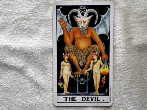 悪魔のタロットカード。欲や不安に流されない姿勢が大切という意味です。周りの意見よりも、自分の意思で選んだものだけを大事にしていくことで、良い流れが続きます。