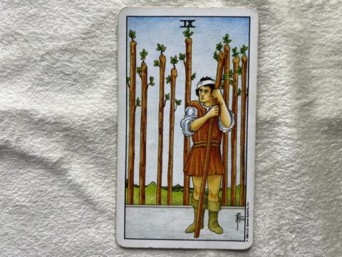 ワンドの9のタロットカード。慎重に進みながらも諦めない強さを意味します。いまの流れを大切にしていれば、望む方向へきちんと向かっていけます。