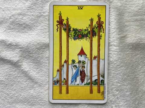 ワンドの4のタロットカード。安心できる環境や心がほっとする関係を大切にすることを意味します。穏やかさや安定を選ぶことで、幸せが確実に積み重なります。