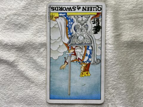 ソードのクイーンの逆位置のタロットカード。完璧にしようとせず、柔らかさを忘れないことを意味します。自分を追い詰めず、肩の力を抜くことで、恋も仕事も自然と良い方向へ動きます。
