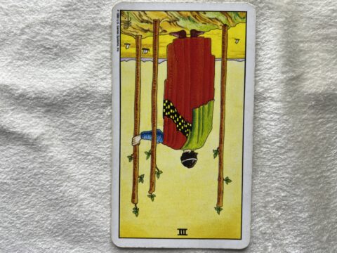ワンドの3逆位置のタロットカード。先のことを決めようとせず、今できる一歩に集中することが大切なことを意味します。今はまだ見えていないだけで、準備さえ整えばチャンスはきます。