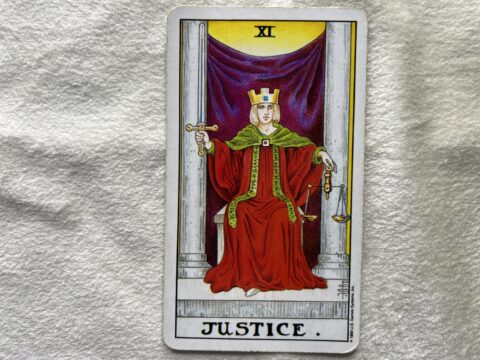 正義のタロットカード。公平な判断と冷静さを大切にすることを意味します。感情に流されず、事実をしっかり見て決断すると、物事がスッと進んでいくでしょう。