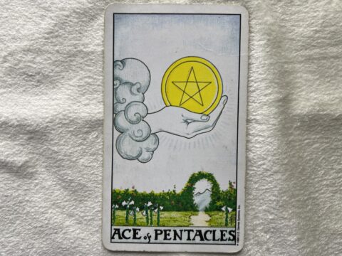 金貨のエースのタロットカード。新しいチャンスや豊かさの始まりを意味します。小さな一歩を踏み出すと、欲しかった未来をつかむための種がまかれます。