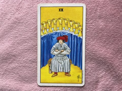カップの9のタロットカード。願いが叶う流れを意味します。今のあなたが素直に「欲しい」と思うものを大切にしましょう。満足できる選択を優先してくださいね。