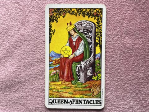 金貨のクイーンのタロットカード。心地よさや豊かさを育てる姿勢を意味します。自分も相手も大切にする余裕のある関わり方を意識してみてくださいね。あなたの魅力が引き立ちます。