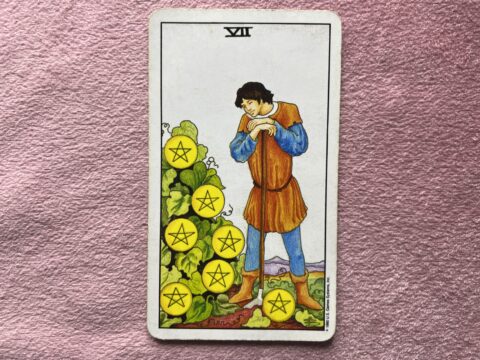 金貨の7のタロットカード。今は途中経過を大切にする時期を意味します。結果を急がず、続けてきたことを見直しながらいきましょう。未来の実りがしっかりと戻ってくるはずです。