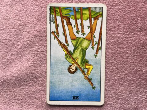 ワンドの7の逆位置のタロットカード。必死にもがくと失敗することを意味します。がむしゃらに戦うより、身軽さを大切にしてみてくださいね。引くべきところは引きましょう。
