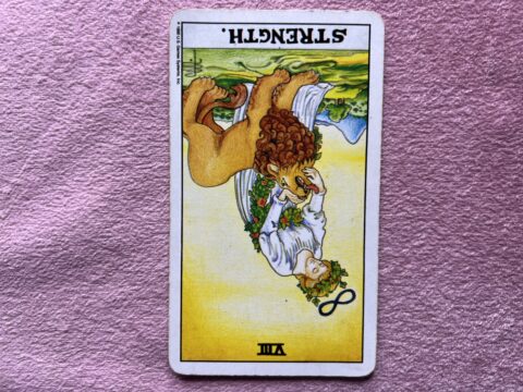 力の逆位置のタロットカード。頑張りすぎないこと、完璧を求めすぎないことを意味します。柔らかさや余白を大切にすると、状況が自然と良い方向へ動き出すはず。