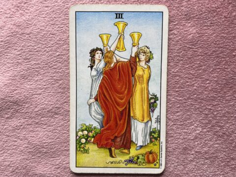 カップの3のタロットカード。喜びを分かち合うことを意味します。嬉しいことを周りとシェアする姿勢が幸運を呼びます。心が上向く瞬間を大切にしてみてください。