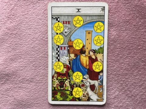 金貨の10のタロットカード。長く続く安心を意味します。今の環境を大切にすると、自然と良い結果が引き寄せられます。未来への基盤づくりを意識して過ごしてみてくださいね。