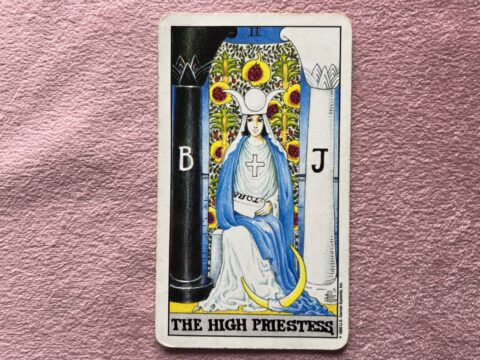 女教皇のタロットカード。静かな観察力と直感を信じることを意味します。迷ったときは一度立ち止まり、心が落ち着くほうを選んでください。自然と正解へたどり着けるはず。