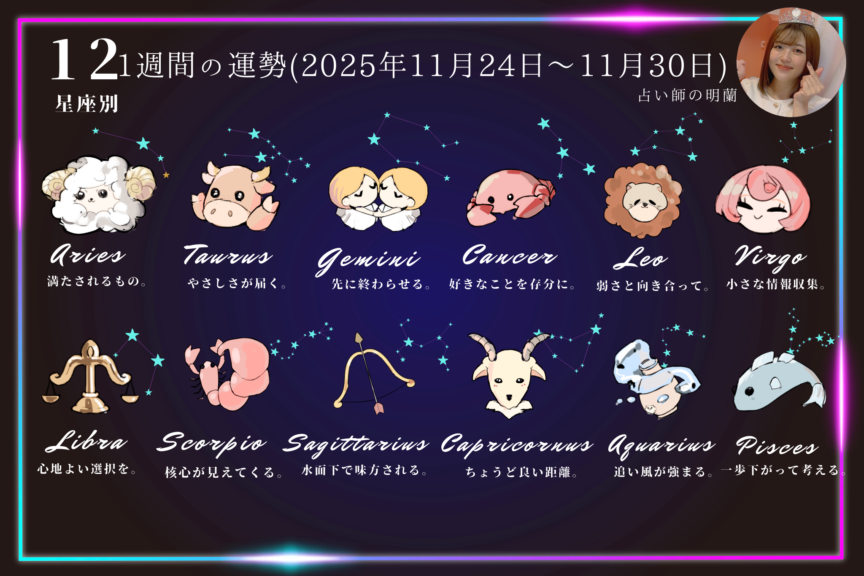 明蘭が占う今週の恋愛・仕事の運勢🌟12星座タロット占いランキング🔮(今週2025年11月24日〜11月30日の運勢)