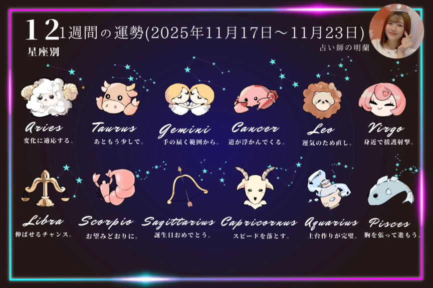 明蘭が占う今週の恋愛・仕事の運勢🌟12星座タロット占いランキング🔮(今週2025年11月17日〜11月23日の運勢)